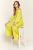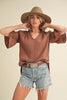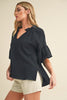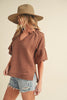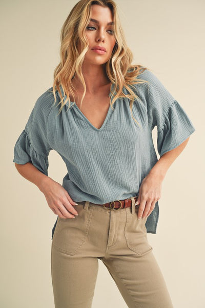 Indulge in feminine charm with Tes v-neck top. The ruffle sleeves add a playful touch, while the boxy fit exudes casual elegance, and side slit adds a hint of allure. Crafted from a cotton-textured fabric, it combines comfort with style.